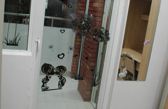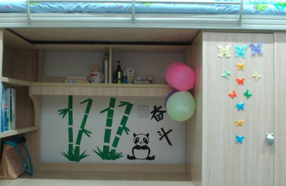 简短的活动开幕式结束后,评审团依次来到必赢76net线路2013级同学所在的4、5号宿舍楼进行参观。推开门,一间间干净整洁的寝室出现在眼前。许多寝室都做了精美的布置,从门到墙,写字台到柜子,甚至阳台、窗户,都有同学们独具匠心的各种装扮——偶像海报、精致墙贴、励志文字、剪纸、折纸……。更有一些寝室还特意制作了代表自身特色的室服。