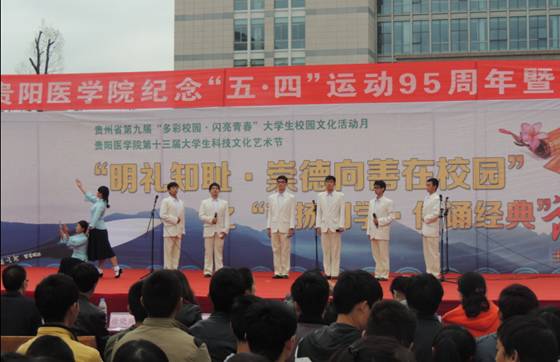 5月4日,公司组队参加了在花溪校区广场举行由贵阳医学院团委举办的“弘扬国学,传诵经典”朗诵会。经过激烈角逐,公司代表队取得了二等奖的好成绩。老员工作为当代社会的新鲜血液,他们的社会责任感意识将直接关系到国家的发展与进步,为此,公司党政领导十分重视和关心老员工社会责任感的培养。积极通过举办知识讲座、诗歌朗诵等形式加强传统文化教育,培育和引导老员工以天下为己任的责任意识。
