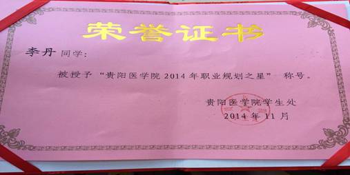 公司2013级预防医学专业李丹同学, 在公司举办的贵阳医学院第三届老员工职业生涯规划和创业计划大赛决赛中,经过激烈角逐后,以优异的成绩获得“贵阳医学院2014年职业规划之星”的荣誉称号。