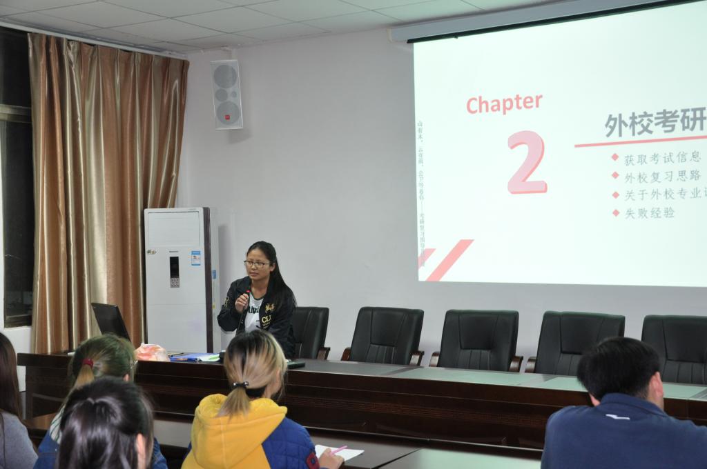 研究生金照凤介绍了外校考研复习思路及注意事项,强调要获取报考学校的信息、知晓学校招生信息和要求,才能有计划的复习。同时还强调要选择适合自己的学习方法,切勿盲目追进度而得不偿失,在保证休息的前提下有效率的进行复习。研究生潘庆礼介绍了本院考研的复习思路、考研后期复习注意事项、本院考研经验及今年本院报考情况,强调考研也是一场心态的考试,以正常的心态去面对,才能迎刃而解。给考研路上的同学们增加了信心。