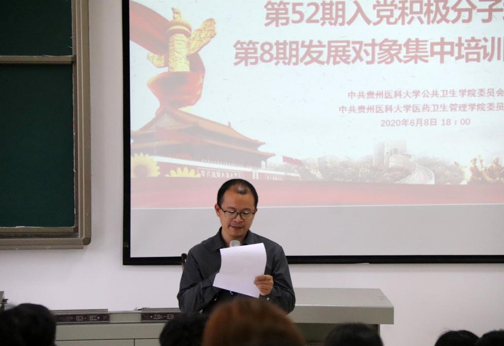 为深入学习贯彻习近平新时代中国特色社会主义思想,加强对入党积极分子和党员发展对象的教育和培养,切实增强大家对新时期党的路线、方针、政策的认识和理解,进一步端正入党动机,严把“入口关”。在公司党委的统一部署下,经过前期的推荐报名和筹备工作,必赢76net线路分党校和医药卫生管理学院分党校联合举办的第52期入党积极分子培训班暨第8期发展对象集中培训班开班典礼于6月8日在南校区7305教室举行。医药卫生管理公司党委书记廖兴江、公司党委副书记何江、必赢76net线路副处级组织员刘亮、医药卫生管理学院分团委副书记周志琳、必赢76net线路辅导员郝雪君、医药卫生管理学院辅导员柳庆英及本期培训班全体学员参加了开班典礼,典礼由柳庆英主持。