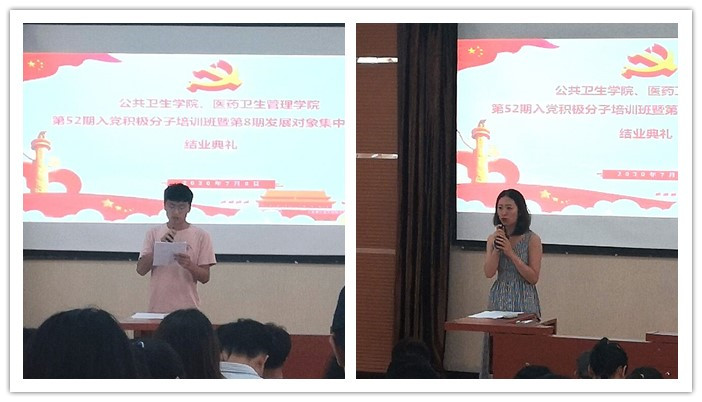 7月8日,必赢76net线路、医药卫生管理学院分党校第52期入党积极分子培训班暨第8期发展对象集中培训班结业典礼在南校区博雅楼一楼阶梯教室举行。医药卫生管理公司党委副书记王倩、公司党委副书记何江、医药卫生管理学院辅导员柳庆英、必赢76net线路辅导员郝雪君以及入党积极分子、发展对象参加结业典礼,典礼由郝雪君主持。