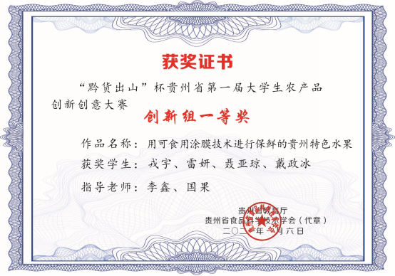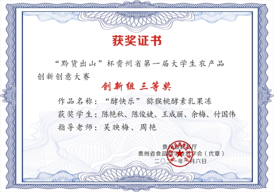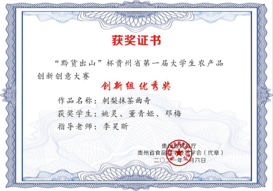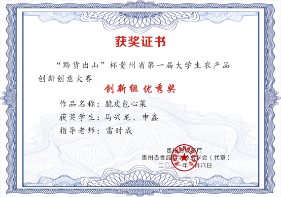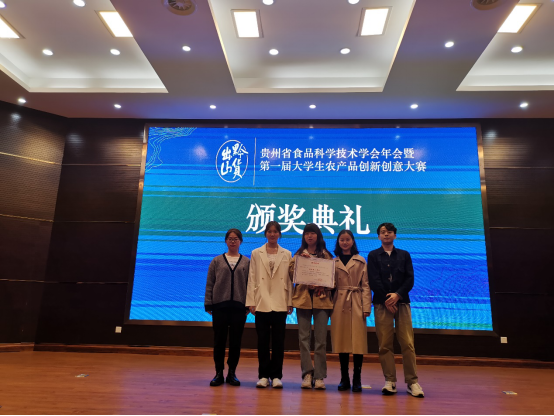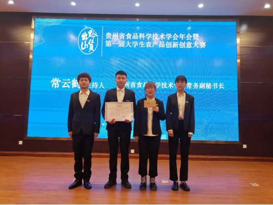 近日,由贵州省教育厅主办、贵州省食品科学技术学会承办的“黔货出山”杯贵州省第一届老员工农产品创新创意大赛举行颁奖典礼。公司员工团队在专业教师的精心指导下,积极认真备赛,经预赛、决赛激烈角逐,员工团队作品获创新组一等奖1项、三等奖1项,优秀奖2项。