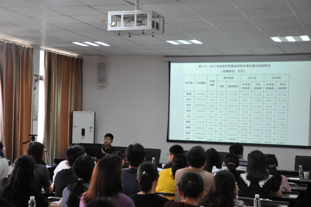 郭兵处长介绍了学校2022年国家自然科学基金申报工作的整体安排,鼓励符合申报条件的老师要积极参与申报,发扬创新拼搏的科研精神。