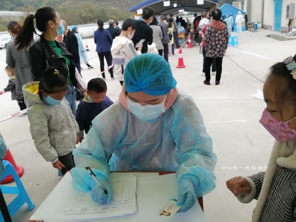10月22日,下午3时,谯瑞指导群众熟悉扫码采样流程。“随着采样群众的不断增多,我们的压力其实蛮大的,现在基本上每天都是晚上10点左右才能到家,而且需要随时待命,一旦接到通知,就要第一时间赶往现场,开展相关工作。”