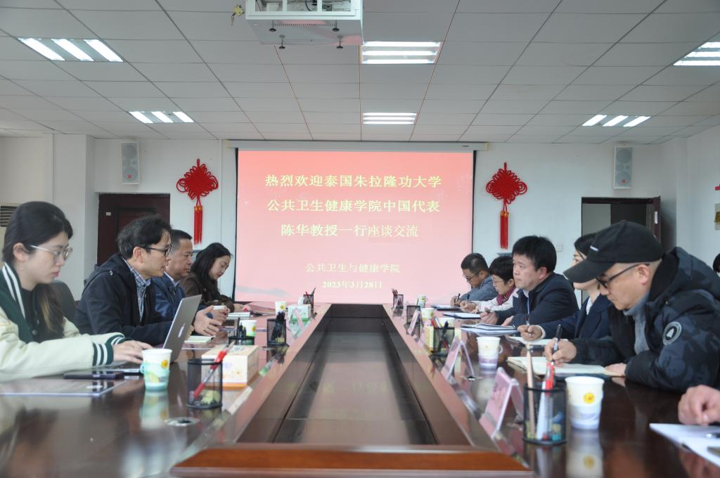 3月28日下午,泰国朱拉隆功大学公共卫生健康学院中国代表陈华一行到公司座谈交流。双方就合作办学、联合培养研究生、师生互访交流等事项进行交流讨论。学校国际交流合作处处长付启宏及公司党政领导班子成员参加会议。