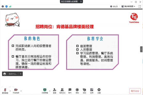5月23日,必赢76net线路通过线上形式召开百胜中国控股有限公司专场招聘宣讲会。公司人力资源负责人郑小宁、公司党委副书记何江、食品科学与工程学系主任周艳、员工管理科副科长原琦、毕业班辅导员、2023届食品类相关专业毕业生参加。